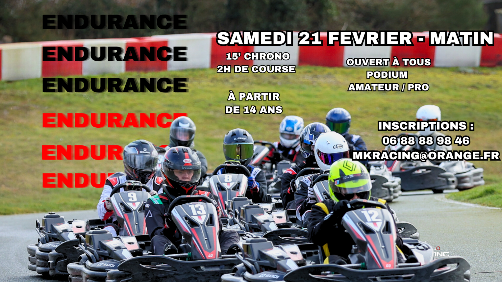 Endurance 15' chrono + 2h de course Lestage individuel selon un barème poids Un classement pro + un classement amateur Endurance de FEVRIER 2026 Samedi 21 FEVRIER 2026 Durée : 2h Inscriptions : • Tarif : 150 € par équipe • Composition des équipes : 2 à 6 pilotes Pour vous inscrire : Par téléphone : 06 88 88 98 46 Par email : mkracing@orange.fr Programme : • 9h00 : Arrivée des pilotes • 9h45 : Briefing + Lestage • 10h00 : Qualifications (15 min) • 10h30 : Départ de l’endurance 2h • 12h30 : Fin de la course • 12h45 : Podium + Remise des prix Inscrivez-vous dès maintenant pour une expérience inoubliable ! Merci de bien préciser votre nom d'équipe lors de votre commande dans l'onglet message " />